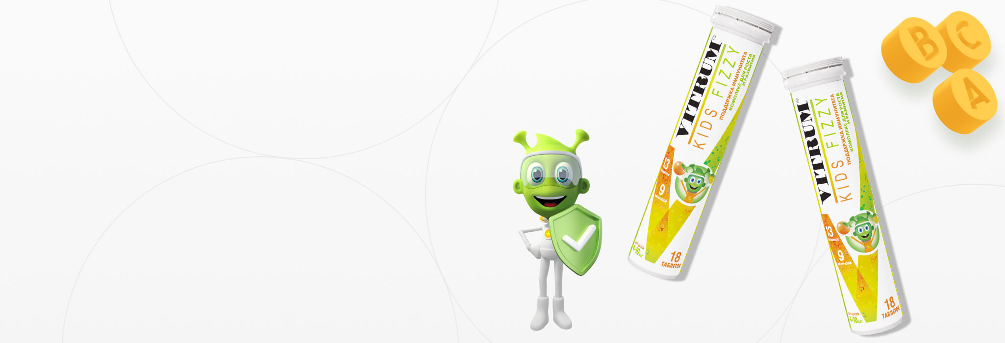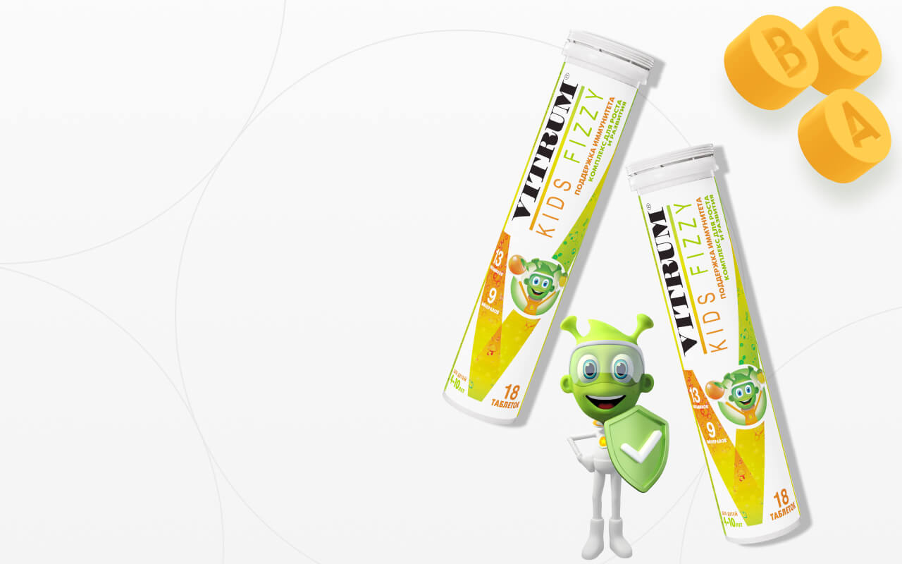 Витаминно‑минеральный комплекс ВИТРУМ® КИДС ШИПУЧИЙ/ VITRUM® KIDS FIZZY — для детей 4–10 лет. Содержит 13 витаминов и 9 минералов, в том числе — витамины группы В и йод, которые способствуют улучшению памяти и внимания и поддерживают нервную систему ребенка, а так же витамин Д и кальций, которые в период интенсивного роста способствуют формированию крепкого скелета.